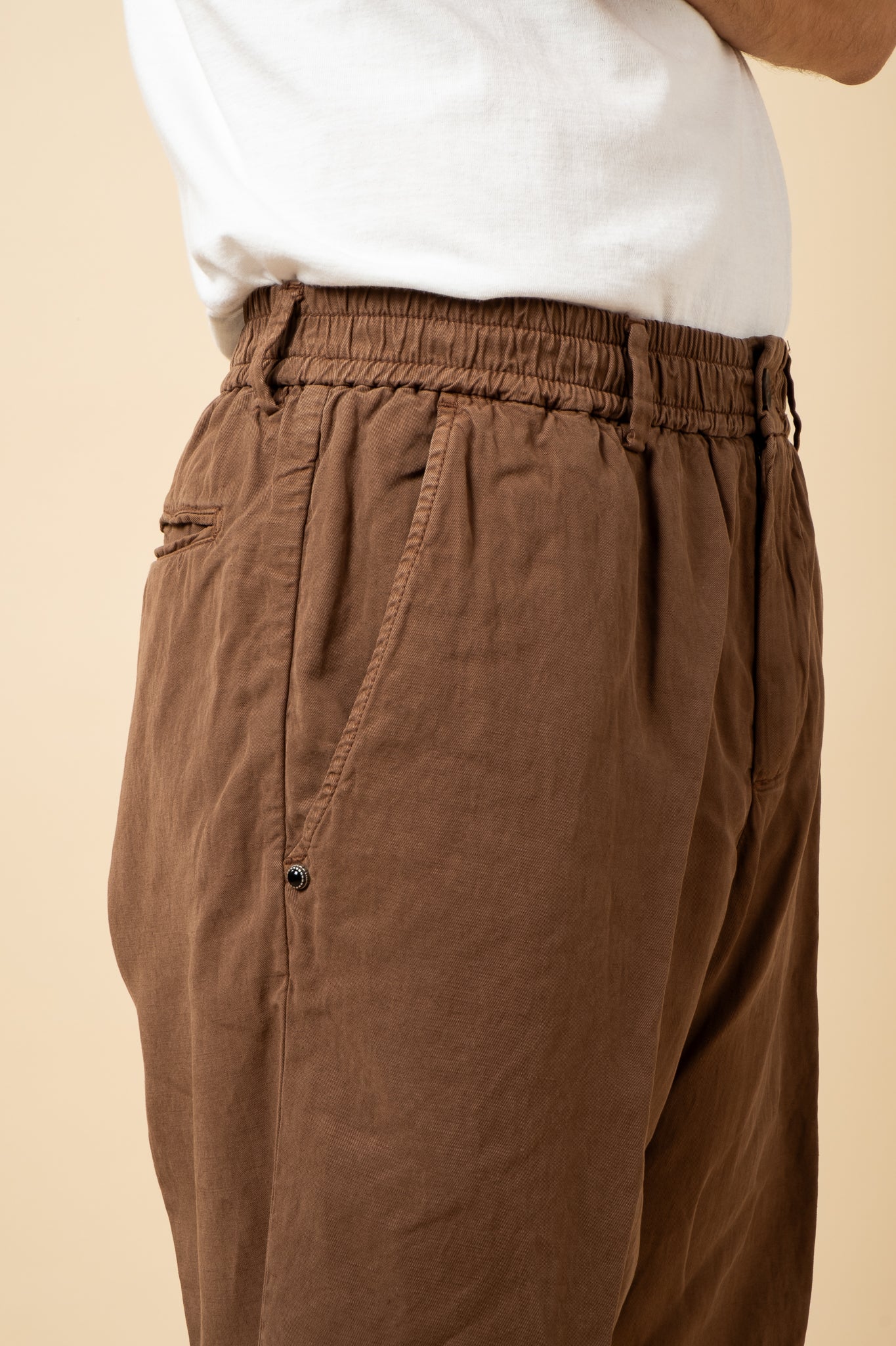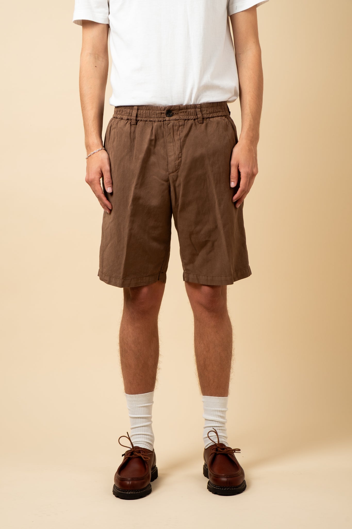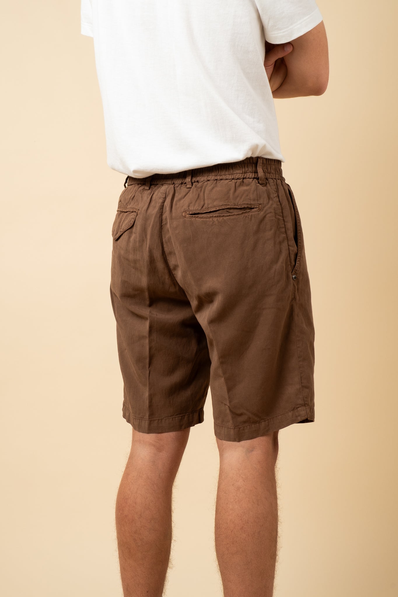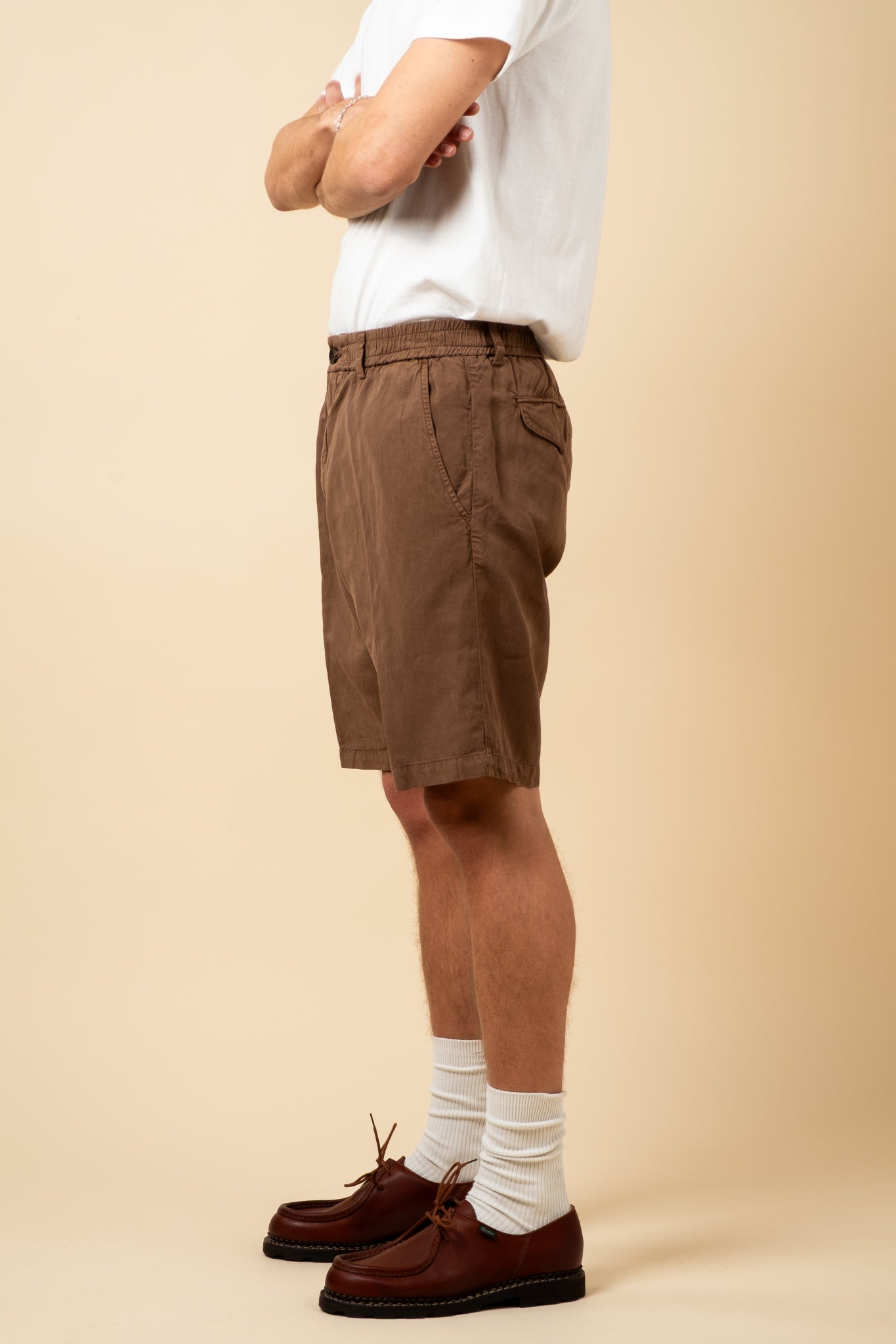 These shorts are based on the classic slacks trouser. Cut from a airy cotton/linen blend and sitting relatively high at the hip. Front pleated with elastic waistband, slit side pockets and open back pockets, as well as White Sands signature black bead rivet.