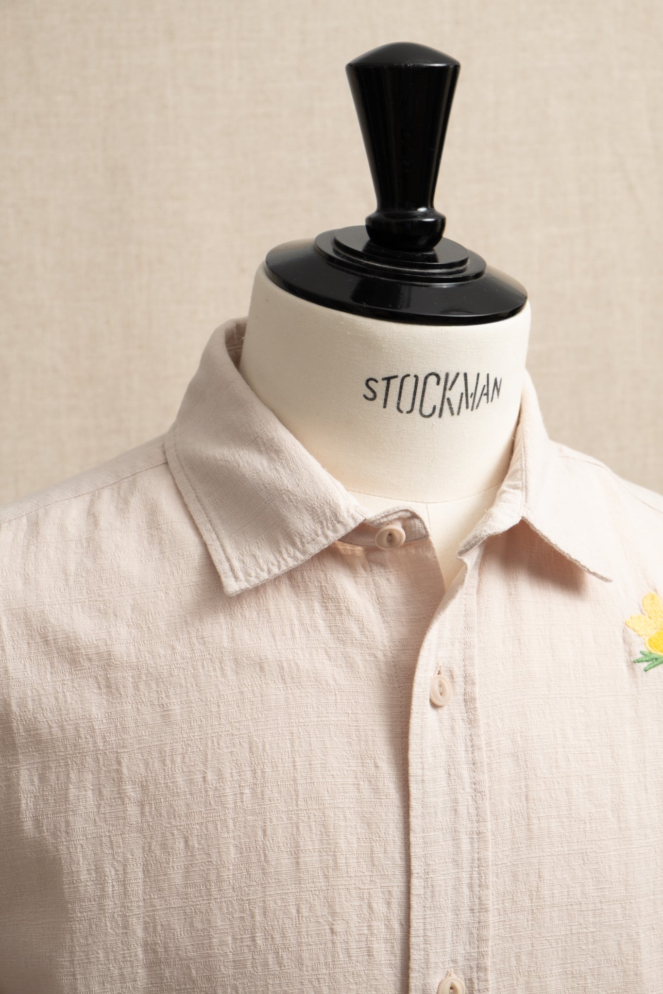 Cut from beautiful, undyed slub fabric of 100/ cotton, this new addition summer shirt features a larger, overized fit, paired with a charming floral embroidery in contrasting yellow.